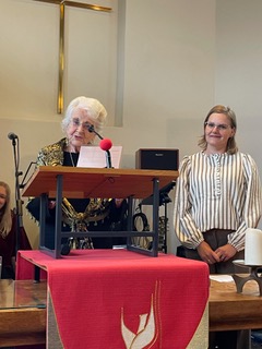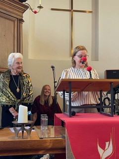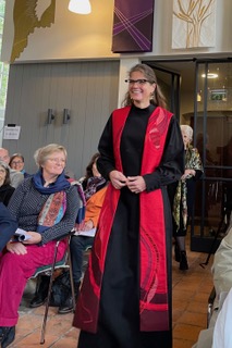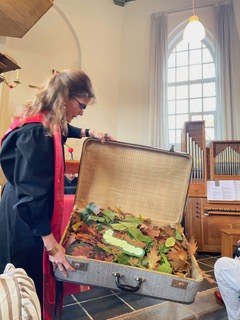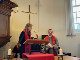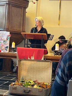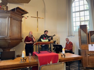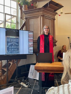 Het was een daverend afscheid, met opnieuw een creatieve dienst voor jong en oud(er) van ds Marloes. Door de gemeente en vele gevers daarbuiten werd een stijlvolle nieuwe toga aangeboden, een ’toga-to-go’, “zodat zij Engelen altijd met zich mee kan dragen”. Prachtige muziek en zang, liefdevolle en humoristische speeches, vrienden en dorpsgenoten en een heerlijke gastvrije borrel na afloop, maakten het feest compleet!