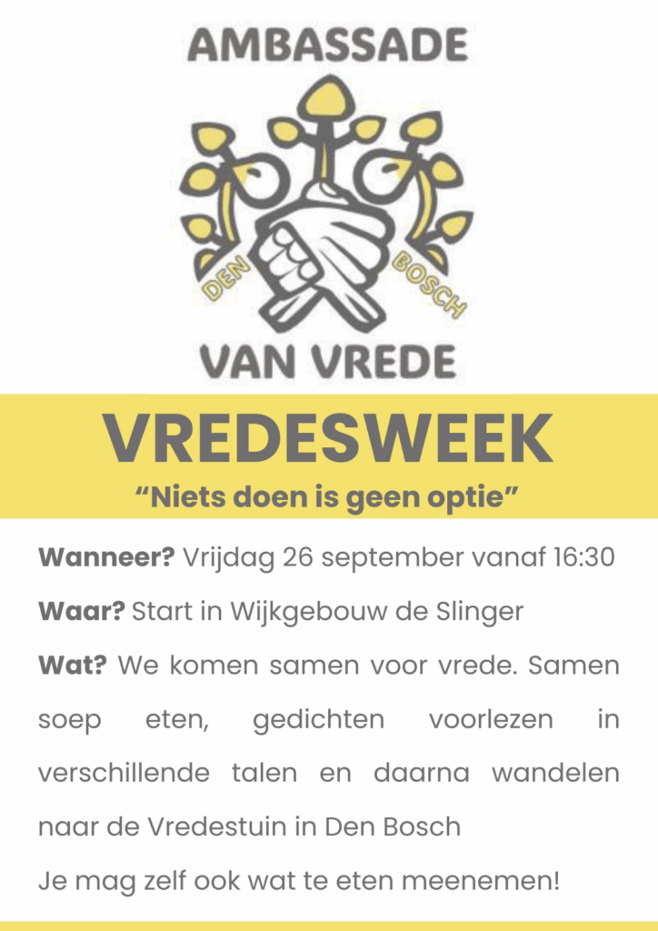 In wijkgebouw de Slinger ( Jan Schöfferlaan 3, 5212 RE ‘s-Hertogenbosch) zal vrijdagavond 26 september vanaf 16:30 een samenkomst plaatsvinden met aansluitende wandeling naar de Vredestuin in de stad (de Casinotuin met het bekende verzetsmonument). (Zie info hierna).